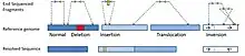 Inversions and translocations are relatively easy to detect by an invalid pair of sequenced-end. For instance, a translocation can be detected if the paired-ends are mapped onto different chromosomes on the reference genome.[4][5] Inversion can be detected by divergent orientation of the reads, where the insert will have two plus-end or two minus-end.