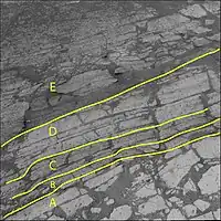 The picture to the right shows changes in the color of the bedrock layers. The layer "A" is closer to the rover and higher than the layers "B" to "E". Texture and rock chemistry also differed with depth. Thus scientists infer that the age of these layers is following a similar pattern, with the higher layers being younger than the lower layers.[4]