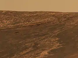 The rover entered the crater interior on its 134th mission sol (June 15), and exited on the 315th sol (December 14).[3] During this time it traversed various obstacles, steep inclines, and overcame large wheel slippage when driving over fine sand.