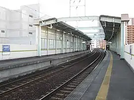 The station has dual opposed elevated side platforms, with the station building located underneath. It is staffed during daylight hours. The station building has automated ticket machines, and automated turnstiles which accept the NicePass smart card, as well as ET Card, a magnetic card ticketing system.