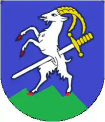 The blazon of the municipal coat of arms is Azure, a Ram rampant Argent horned Or and langued and hoofed Gules, pierced by a sword Argent hilted Or, on four mounts Vert.[4]