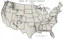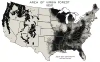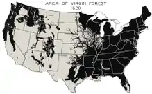 Native Americans cleared millions of acres of forest for many reasons, including hunting, farming, berry production, and building materials.[30] Prior to the arrival of European-Americans, about one half of the United States land area was forest, about 1,023,000,000 acres (4,140,000 km2) estimated in 1630. Forest cover in the Eastern United States reached its lowest point in roughly 1872 with about 48 percent compared to the amount of forest cover in 1620. The majority of deforestation took place prior to 1910 with the Forest Service reporting the minimum forestation as 721,000,000 acres (2,920,000 km2) around 1920.[31] The forest resources of the United States remained relatively constant through the 20th century.[32] The Forest Service reported total forestation as 766,000,000 acres (3,100,000 km2) in 2012.[33][34][32] A 2017 study estimated 3 percent loss of forest between 1992 and 2001.[35]