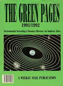 - 1991: First National Conference on Environment and Development; Environmental Monitoring Group releases a document "Towards Sustainable Development in South Africa";[4] General Magnus Malan takes over as new Minister of Water Affairs and Forestry; Bev Geach of the Weekly Mail publishes The Green Pages, a directory of environmental groups