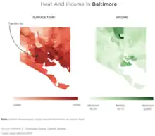 A study involving 108 urban areas found that neighborhoods with a history of redlining were five to twelve degrees hotter than neighborhoods without redlining.[67] This increase in temperature is caused by the urban heat island, an area which has a slightly warmer climate than the surrounding area. Low income communities are acutely at risk to heat mortality because of reduced access to air conditioning as well as tree cover.[68] "Temperatures on a scorching summer day can vary as much as 20 degrees across different parts of the same city, with poor or minority neighborhoods often bearing the brunt of that heat".[69]