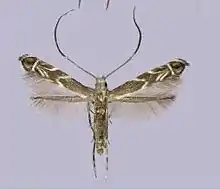 The wingspan is 7–8.3 mm. The forewings are dark brown with a narrow white band on the dorsum from the base to 1/3 of the entire length and with three pairs of narrow white bands beginning at the costal and dorsal margin near 1/2 to 3/4 length of the wing and extending obliquely toward the wing apex, terminating before reaching mid-width of the wing. There is a narrow silver band with metallic reflection extending from the costa to the dorsum at 5/6 length and the distal 1/6 is brown with a black dot centrally, franked by a narrow white band near the dorsum. The distal end is fringed with a narrow white band and terminating with a narrow dark brown band. The hindwings are dark brown.