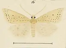 The wingspan is 23–27 mm. The forewings are whitish ochreous with a cloudy central streak, more yellowish ochreous from the base to beyond the middle and containing several small dots of black scales. There is an ill-defined longitudinal blackish line in the disc, as well as some fine scattered black dots towards the hindmargin.[2] The hindwings are dark grey in females and whitish in males.[3]
