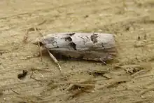 It is easy to identify with its creamy or whitish gray wings, and blackish marking on either side of the median area, starting half way between the costa and dorsum and finishing at the dorsum.