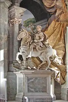 The equestrian statue of Charlemagne (1725), which portrays the Holy Roman Emperor Charlemagne (742–814),[1][2] was commissioned by Pope Clement XI (1649–1721) and carved by the Italian artist Agostino Cornacchini (1686–1754). It stands to the left of the portico of St Peter's Basilica.