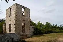 The Rookwood Harris Woolen Mill, which was constructed on the banks of the Eramosa River in 1867, was abandoned in 1925.[4] The first textile mill in the region, the machinery inside was powered by the flowing waters of the Eramosa while it was operational. A. J. Casson, a member of the famed Group of Seven painters, visited the site at one point to paint the mill and the Eramosa River. The building became a local landmark until it was closed to the public in 2007 when the structure (which had been gutted in a 1967 fire) was deemed unsafe. Restoration was undertaken on the structure (costing $850,000) by the Rockwood Conservation Area and it was ultimately reopened in August 2011.[7]
