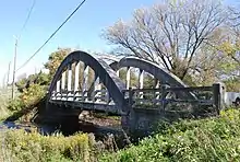 MacQuillan's Bridge, a 21.3 metres (70 ft) concrete arched truss bridge (also known as a "bowstring bridge"), was constructed in 1916 to replace an earlier wooden bridge.[3][15] As little boat traffic passed along this point of the Eramosa River, Wellington County engineer A. W. Connor and Italian-Canadian mason Charles Mattaini built the bridge low over the water.[16] The bridge is named for the McQuillan family, which settled in Guelph in 1827, and is today also known as the Stone Road Bridge. It was named an Ontario Heritage Bridge in 2004. It is located along the township boundary between Guelph and Puslinch.
