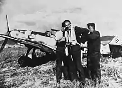 ![]() Kageneck in front of his Messerschmitt Me 109E in Sicily, with ground crew | |