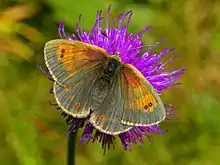 The wingspan is 32–38 mm.[10] These small butterflies have a brown forewings with a metallic-greenish shine, the so-called "brassy ringlet". On the forewings there is an orange postdiscal band and two small ocelli pupillated with white towards the apex. A series of small ocelli appears on the hindwings. The underside of the forewings is orange with a brownish border and two small ocelli at the apex, while the hindwings are shiny silvery gray and ocher.[11]