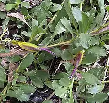 Eremophila biserrata is a prostrate shrub often with long unbranched snake-like stems up to 1 m (3 ft) long and under ideal conditions the plant may spread to a diameter of 4 to 5 m (10 to 20 ft). Its leaves are arranged alternately or clustered in rosettes, mostly 18–24 mm (0.7–0.9 in) long, 5–11 mm (0.2–0.4 in) wide, broadly lance-shaped with the narrower end towards the base. The leaves have serrated edges, the serrations often themselves serrated, sometimes deeply so that the leaf appears to have separate leaflets.[2][3][4]