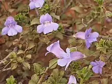 Eremophila enata is a flowering plant in the figwort family, Scrophulariaceae and is endemic to central areas of Western Australia. It is a low, spreading shrub with serrated leaves and purplish to pinkish flowers.