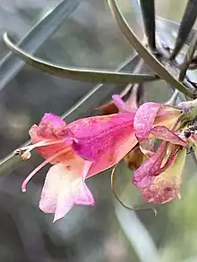 The flowers are borne singly or in groups of up to 4 in leaf axils on hairy stalks 3–10.5 mm (0.1–0.4 in) long. There are 5 hairy, spoon-shaped to lance-shaped sepals which are mostly 7–18 mm (0.3–0.7 in) long and which are cream-coloured or brown. The petals are mostly 20–30 mm (0.8–1 in) long and are joined at their lower end to form a tube. The petal tube is cream-coloured with a pink tinge, pink, red or (rarely) maroon. The tube and its lobes are glabrous apart from the margins of the lobes, and the inside of the tube which is hairy. The 4 stamens extend slightly beyond the end of the petal tube. Flowering occurs from winter to early summer[3] and the fruits which follow are oval to cylindrical in shape and 4–7 mm (0.2–0.3 in) long.[2][3][4][5]