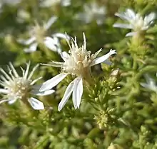 Ericameria resinosa is a shrub up to 50 cm (20 inches) tall. It has thread-like or narrowly oblanceolate leaves up to 25 mm (1 inch) long, with resinous glands on the surface. Flower heads are white, with 10–15 disc florets and 0–7 ray florets.[7][8] Its habitats include rocky plains, steep hillsides, and rocky cliffs.[8]