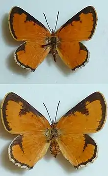 Erikssonia edgei, commonly known as the Waterberg copper, tilodi copper or Edge's acraea copper, is an obligate myrmecophylous lycaenid butterfly,[1] which is native to Limpopo, South Africa. The critically endangered butterfly occurs in high-altitude grasslands on sandy substrates, and has only been obtained from the type and one subsequent locality. The population at the type locality, a farm in the Waterberg, went extinct about 12 years after its 1980 discovery.[2] It was afforded species status in 2010, when no extant populations were known. The status of two populations, discovered in 2013 at a private nature reserve to the southeast, remains indeterminate.