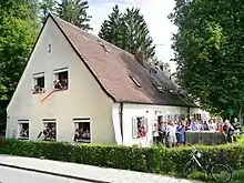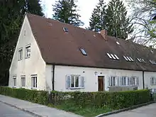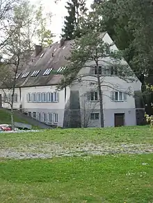 In 1963 the ground-floor of the building was converted into flats for teachers [lower-alpha 2] and in the attic rooms for the pupils of the catholic school Spätberufenenseminar St. Matthias were installed.[11][16][17] The seminar complex itself had been built in September 1957 in the immediate neighbourhood of the former sanitation facility. The members of the Spätberufenenseminar St. Matthias called it "Badebau",[18][16][9] a name which became popular in Waldram.[19]