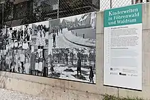 The photo documentation Kinderwelten in Föhrenwald und Waldram (Children's Worlds in Föhrenwald and Waldram) is always on display outside the museum. The exhibition Kinderwelten in Föhrenwald und Waldram (Children's Worlds in Föhrenwald and Waldram) serves as basis; the concept for this was created by Kirsten Jörgensen (†) and Sybille Krafft.[35] The outdoor presentation tells the stories of the Jewish children's lives in the Föhrenwald DP camp using historical pictures provided by private individuals as well as documents from international archives. The photographs are contrasted using similar images of Catholic children in Waldram to show the differences as well as the similarities of both groups.[33][36][37]