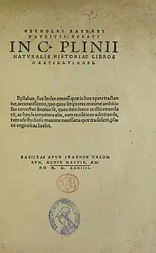 His own work, De Coelibatu was less influential, but Barbaro's Castigationes Plinianae, published in Rome in 1492 by Eucharius Silber, was perhaps his most influential work.[3] In this discussion of Pliny's Natural History Barbaro made 5000 corrections to the text.[2] The work was written in only twenty months and dedicated to the newly elected Pope Alexander VI.[4] Castigationes Plinianae was considered by Barbaro's contemporaries to be the most authoritative work on Pliny. Even before his death, he was considered a leading authority on the Greek and Latin works of antiquity. Erasmus frequently cited Barbaro's works, often with respect.[3]