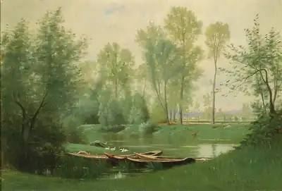 "His professional life has been spent in Boston, with frequent visits to Europe."[1] In the 1870s he kept a studio on West Street.[3] He exhibited at the National Academy of Design in 1871 and 1875; the Williams & Everett gallery in Boston in 1875; the 1876 World's Fair in Philadelphia;[1] and Boston's Museum of Fine Arts and the St. Botolph Club in 1880.[4][5] He belonged to the Boston Art Club.[6] He moved to New York around the turn of the century.[7]
