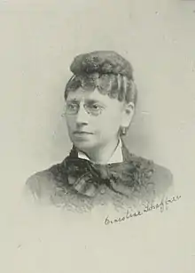Ernestine Schaffner (known as "The Prisoner's Friend"; ca. 1828 – June 18, 1902) was a German-born American prison reformer. She was the first to do volunteer missionary work among those detained in the New York City Prison,[1] known as The Tombs, having the financial means to indulge her charitable leanings in a substantial way. Daily, she left her luxurious home in New York City to try and right some of the wrongs inflicted by society and the law. In 1890, Schaffner's philanthropic work had grown to be so extensive that she engaged a salaried lawyer to attend to the legal part of it, and at the same time, she opened an office near The Tombs at 23 Centre Street. Here she advertised: ‘Free Advice to the Poor and the Innocent Accused.’ Schaffner was regularly out US$20,000 in bail bonds, and she had a considerable sum lent to those who had been prisoners.[2] She and Rebecca Salome Foster were known as "The Angels of the Tombs".[3]