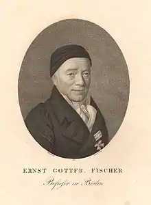 Ernst Gottfried Fischer (17 July 1754 – 27 January 1831) was a German chemist. He was born in Hoheneiche near Saalfeld. After studying theology and mathematics at the University of Halle, he was a teacher in Berlin before becoming Professor of Physics in 1810. He translated Claude Berthollet's publication Recherches sur les lois de l'affinitié in 1802. He proposed a system of equivalents based on sulfuric acid equal to one hundred.