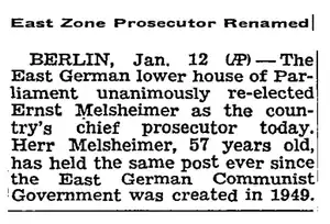 - ↑ Sabina Lietzmann [in German] (5 April 1956). "Ernst Melsheimer - Ein deutscher Wyschinski: Nach Kriegsende trat Melsheimer sofort der KPD bei. ... 1946 wurde er Vizepräsident der Zentralverwaltung für Justiz und 1949 Generalstaatsanwalt der DDR". Die Zeit (online). Retrieved 26 October 2014.