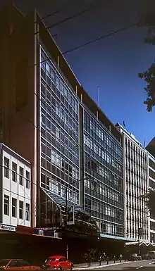 When Plischke arrived in New Zealand in 1939 with his wife Anna, he was already known in architectural circles to be at the forefront of modernist design.[2] He began working for the Ministry of Housing on projects such as the Dixon Street Flats. In 1942, he designed the Abel Tasman Monument for a site in Golden Bay for the tercentenary of Abel Tasman's visit to New Zealand.[3] From 1943–47 he worked for the Department of Town Planning producing work in areas including: Naenae, Trentham, Tāmaki and Mangakino. He also completed private work during this time, including the Frankel House in Christchurch (for Otto Frankel), which was his first commission.[4] Frankel House is a Category 2 entry on the Heritage New Zealand register.[5]