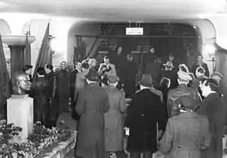 Ernst Thälmann, the Communist Party of Germany's chief who was executed by the Nazi regime in 1944 after spending 11 years in prison, was revered as a national hero and a martyr in the nascent East Germany.[2][3][4] Thälmann's character combined communist convictions with an uncompromising struggle against Fascism; in a broader sense, he served as part of what author Russell Lemmons referred to as East Germany's "foundation myth": the belief that the communists were the most authentic anti-fascists, and therefore, their successors in the Socialist Unity Party of Germany were the legitimate leaders of a new German state.[5] Thälmann became the center of what many historians saw as a cult of personality.[2][3][4] This veneration required all controversial aspects of his political career be repressed from mass consciousness.[6] Journalist Erich Wollenberg wrote that in the Ernst Thälmann films, "the Thälmann cult reached its apotheosis."[7]