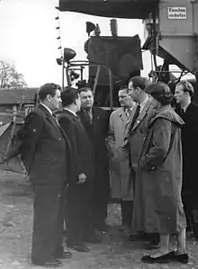 The film was conceived in 1948, after the Soviet Occupation Zone's provisional authorities and the leadership of the SED commissioned it; according to director Kurt Maetzig, "it was handed down from above".[1] Willi Bredel and Michael Tschesno-Hell, both political functionaries, were exempted from all their other duties to concentrate on writing the script. A 'Thälmann Committee' was convened to direct the production of the film; its members included representatives from the Ministry of Culture, the Ministry of Press and Agitation, the DEFA studio,[8] and Thälmann's widow, Rosa, although she was removed in 1949.[9] The committee held its first meeting on 8 October 1948. At the third meeting, on the 27th, the members decided that portraying Thälmann's entire life would make the film too cumbersome, agreeing it should concentrate only on the important historical events. The resolution also stated that the plot should focus on meetings between Thälmann and small groups of people, who would be seen embracing Socialism after being convinced by "the radiance of his personality". At the fourth meeting, it was suggested to begin the plot only in 1931 and stress Thälmann's part in the 1932 public transportation strike; yet member Otto Winzer pointed out that in order to appeal to the youth, the picture should deal with the protagonist's earlier years.[10]