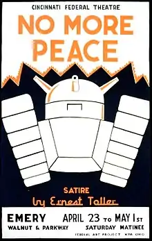 Two of his early plays were produced in New York in the 1930s: The Machine Wreckers (1922), whose opening night in 1937 he attended, and No More Peace, produced in 1937 by the Federal Theatre Project and presented in New York City in 1938. Their sense of immediacy was gone: the first play was related to the First World War and its aftermath, and the second an earlier period of the rise of the Nazis. Their style was outmoded for New York, and the poor reception added to Toller's discouragement.[10]