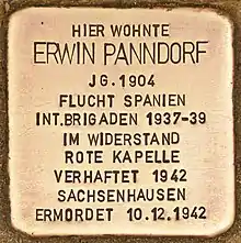 "Erwin Panndorf was born in this house on 7 Jan. 1904. Commissioner of the CC of the KPD. Organiser and resistance fighter against fascism. Murdered in Sachsenhausen concentration camp on 10 Dec. 1942."[7]