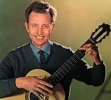 Karlsson sings Omkring tiggarn från Luossa to the setting composed by the Swedish singer Gunde Johansson; he performed the song in ballad style, accompanied only by his acoustic guitar, on his 1963 album Dan Anderssons Dikter Och Visor.[13][14][7] The setting to Jag väntar... was composed by the Swedish troubadour and painter Gunnar Turesson. He recorded the song in 1941.[15][7] Helgdagskväll i timmerkojan was set to music by the Swedish singer, musician and sculptor Sven Scholander, known for his solo performances of Carl Michael Bellman's 18th century Fredman's Epistles. He recorded the song in the 1930s, accompanying himself in Bellmanesque style on the Swedish lute.[16][7][17]