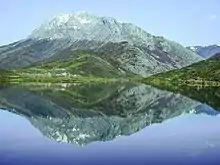 Southeast view of Espigüete reflected in the Camporredondo Reservoir.