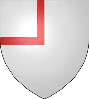 Esquarre (Fr., alternately escarre, esquierre;[1] as Anglo-Norman alternately esquarie, esquire, esquierre, esquerre[2]) is a name for both a heraldic ordinary[3] and a set of related mobile charges.[4] As an ordinary, the Esquarre is defined as a charge that borders a quarter (Fr. franc quartier, or a singular quarter as charge)[5] on its two interior edges abutting the field.[6] The Esquarre isolates the quarter from the rest of the field.[7] De Galway suggested that the Esquarre is employed when both quarter and field are the same tincture.[8] The shape of the ordinary is likened to a carpenter's square, a tool formed of two arms joined perpendicularly.[9] When the two arms are of unequal length, the term potence (Fr.)[10] is also used, a term likening the form of this variant to a joined post and crossbeam, or gallows/scaffold.[11]
