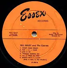 The label also released the first 12-inch album of rock and roll music with its 1954 Haley compilation Rock with Bill Haley and the Comets. Haley's first big hit, "Crazy Man, Crazy" was followed by two other chart hits, "Fractured", and "Live It Up". In 1954, Haley left Essex for Decca Records. The primary female vocalist on the label was Bunny Paul, who scored hits in 1954 with "Such a Night" and "Honey Love".[2] The colour of the Essex label was primarily orange with the print in black,[1][3] but several singles were released on a blue label.
