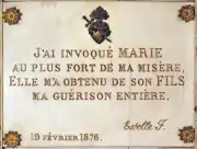 On Friday night, Mary did not come and stand at the foot of the bed, as on the previous nights, but drew close to her. She showed Faguette the plaque which she must have placed as a thanksgiving, bearing the words: 'I called upon Mary in the depths of my misery. She obtained for me, from her Son, my complete cure.' The plaque was not plain white, but had a golden rose on each corner, and at the top, a heart on fire, crowned with roses, pierced by a sword. Indeed, on Saturday, Faguette was cured when she received Holy Communion. Immediately she was able to eat and drink normally, and within a few days, she resumed domestic and gardening duties with no sign of fatigue.