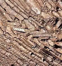 Tight fold in radiolarian chert, a deep-water marine rock and one of the diagnostic rock types in the Franciscan Assemblage. This Estero Bluffs outcrop is likely Cretaceous in age.