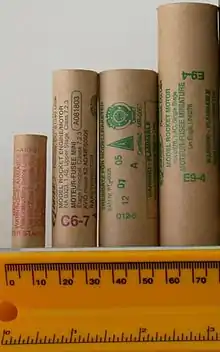 Estes Rocket motors. From left, 13mm A10-0T, 18mm C6-7, 24mm D12-5, 24mm E9-4