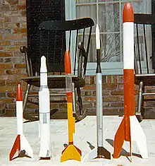 Estes produced a wide variety of rocket model kits, normally using paperboard tubing for the fuselage and balsa wood for fins and nose cones. Early models tended to be relatively simple in design terms, differing in terms of size, number of stages and recovery method. The first kit offered by Estes was the Astron Scout (Rocket Kit K-1) and sold for $ .70. This kit was followed by the Astron Mark (K-2) and the Astron Space Plane (K-3). A more advanced rocket, the Astron X-Ray, featured a see-through plastic payload compartment. Another particularly well-known design from this era was the Camroc, a small camera that replaced the nose cone of larger models that was designed to take a single image on a small disk of film when the motor had burned out and the rocket was facing downward. The Cineroc used a small movie camera that could be launched from larger rockets, taking a series of frames as the rocket ascended. In the 1960s, Estes featured scale models patterned after the popular NASA designs such as the Gemini-Titan and the Saturn-V crewed rockets.