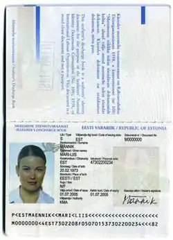 An Estonian seafarer's discharge book (Estonian: Meremehe teenistusraamat) is an identity document issued by Estonian Police and Border Guard Board in which the name, date of birth or personal identification code, and a photograph or facial image and the signature or image of signature of the holder are entered, unless otherwise provided by law or legislation established on the basis thereof. A seafarer who is an Estonian citizen shall be issued a seafarer’s discharge book which complies with the requirements of the “Convention concerning Seafarers’ National Identity Documents” of the International Labour Organisation (ILO). A seafarer’s discharge book shall be issued with a period of validity of up to five years.[1]