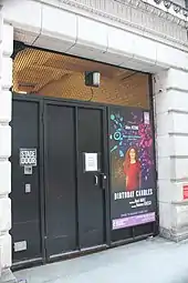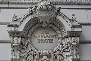 The facade is symmetrically arranged. The ground floor is clad in rusticated blocks of terracotta, painted in a limestone color, above a granite water table. At ground level, the auditorium entrance includes two arched openings, each with four aluminum and glass doors. The voussoirs of the arches are made of rusticated blocks, while the keystones at the centers of each arch are shaped like brackets. Within each arch, the spaces above the doors are infilled with black glazed tiles; originally, these spaces were filled with metal tracery. Between the arched doors is a smaller doorway, which is topped by a large keystone. Above all of these openings is a marquee with the name "Barrymore", which is supported by ornate bronze brackets.[15] The presence of the large marquee obscures the contrast between the ground floor and upper stories.[16] The brackets originally supported a smaller bronze-and-glass canopy, which curved upward in front of either arch.[5][17]