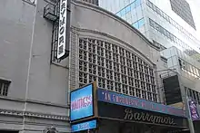 On either side of the doors are terracotta niches with bronze-framed sign boards. Above the signboards are terracotta wreaths, which surround circular panels with the gilded letters "The Barrymore Theater". Each wreath is topped by a curved pediment. The western and eastern portions of the facade are recessed slightly and contain recessed openings.[15] The opening to the east is marked as the stage door.[10][15] A frieze, decorated with leaf and wave moldings, runs above the first floor.[15] To the east, there was originally a stage house with fire escapes on its facade, but this has since been replaced with the Morgan Stanley Building.[17]
