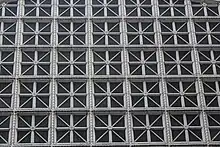 The upper stories are faced in bonded glazed-white brick.[15][17][18] The central part of the facade includes a terracotta screen with an Ancient Roman-inspired pattern, surrounded by a cord molding. The screen includes a grid of squares, each of which contain central medallions with bars radiating in eight directions. To the left of the screen, the wall contains a sign with the name "Barrymore" and a metal fire escape. A metal sign hangs from the facade to the right. The top of the screen curves upward in a manner resembling a proscenium arch, and a brick parapet rises above the screen. A Greek key frieze and a cornice with talon moldings runs above the entire facade.[15] Contemporary media from the theater's opening cited the top of the facade as being 62 ft (19 m) above the sidewalk, while the screen was 52 ft (16 m) wide.[6][18]