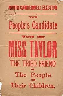 Leach's many achievements attracted widespread attention; she was elected to the committee of the National Educational Association, and lectured for the Land and Labour League.[1] She was active in the women's suffrage movement from the early 1880s.[2] In 1885, she was election agent to Helen Taylor's campaign in Camberwell North at the 1885 general election, although the returning officer refused to accept Taylor's papers, as women were not permitted to stand.[3]