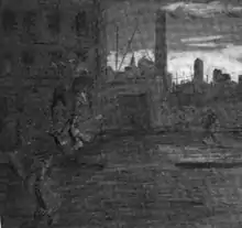 Roger Fry, the English artist and writer and curator of paintings at the Metropolitan Museum of Art, had bought a number of Jerome's drawings for his private collection. He urged Jerome to go to London, where Fry believed he would find a rich market for his work.[19] Thus, the three members of the Myers family, together with two steamer trunks filled with paintings and other art works, left for London in 1914. The New York Times reported in their column, "What Well-Known New York Artists Are Doing These Hot Days," with this item: "Europe has lured Jerome Myers from his haunts in the metropolis, and this summer he will portray other character types in London, Paris, and other continental cities, which doubtless will be displayed in New York next season." The date was June 28, 1914. One month later to the day would mark the start of the First World War.