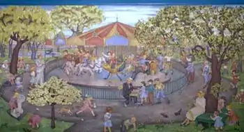 The Flagg-Rochelle Public Library contains a mural, Merry Go Round by Ethel Spears, painted and installed in 1938. Murals were produced from 1934 to 1943 in the United States through the Section of Painting and Sculpture, later called the Section of Fine Arts, of the Treasury Department. The WPA was the largest and most ambitious American New Deal agency, employing individuals to carry out public works projects.[7]