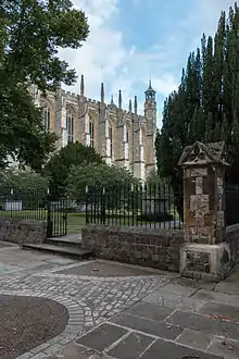 The chapel was planned to be a little over double its actual length, but this plan was never completed owing to the downfall of the founder Henry VI. A plaque on a building opposite the west end marks the point to which it should have reached.[1] The Chapel is built in the late Gothic or Perpendicular style.
