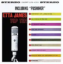 Etta James Top Ten was released in 1963 on the blue and silver Argo label. The album's title was derived from the tracks it contained, her ten top record hits in the previous three years. It included previously released tracks such as "At Last", "All I Could Do Was Cry", "My Dearest Darling", "Trust in Me", "Something's Got a Hold on Me" and "A Sunday Kind of Love". It also included the newer songs "Pushover", "Stop the Wedding" and "Would It Make Any Difference to You" which all became major hits on the Rhythm and Blues Records and Billboard Pop Chart.[2] The album was released on a 12-inch LP, available in stereo.[3]